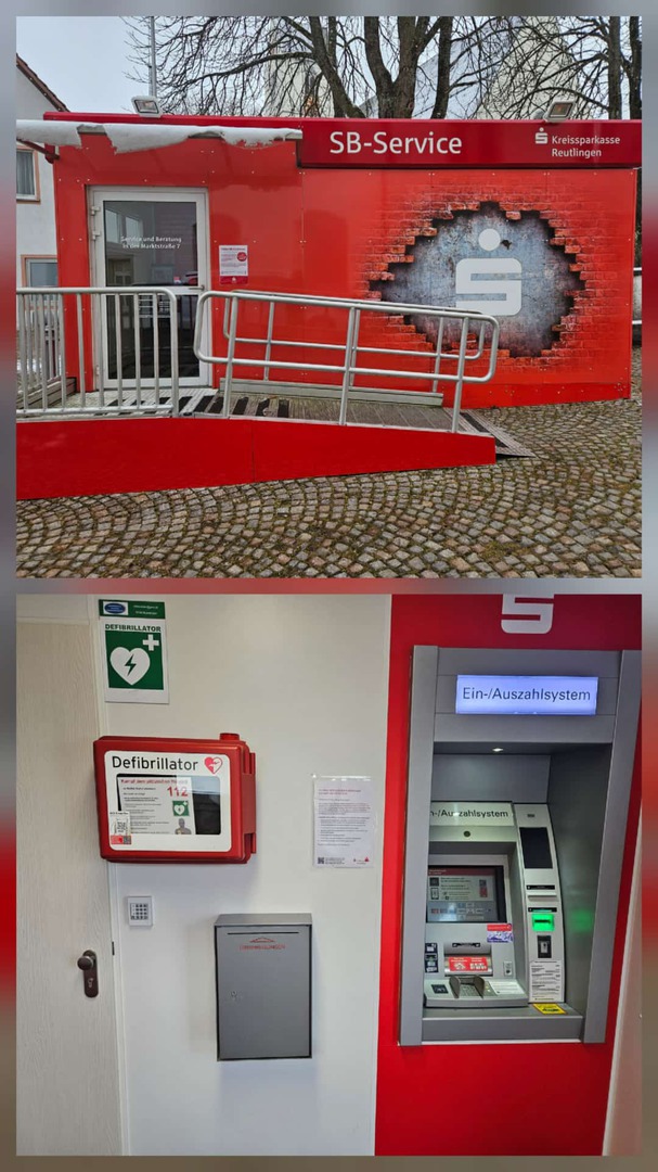 So lange die Filiale der Kreissparkasse in Trochtelfingen umgebaut wird, zieht der öffentliche Defibrillator in den SB Container re. vom Sparkassen Gebäude.
